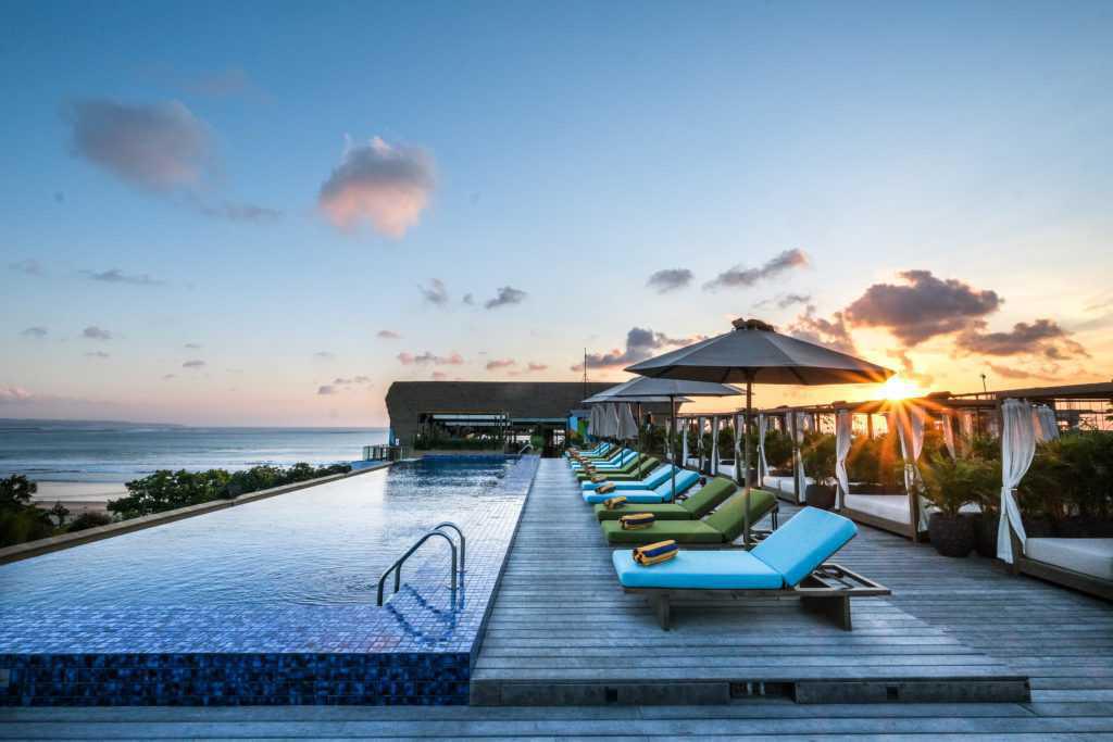 Set around a gem-blue rooftop infinity pool, there’s no better spot to kick back in Bali under the shade of a cabana or daybed lounger to drink in the view. With a sweeping island panorama, overlooking the rolling surf of Bali’s western beaches, and the tallest seat in town — settle in, grab a sundowner and soak in yet another dreamy Kuta sunset at a bali pool club like no other!