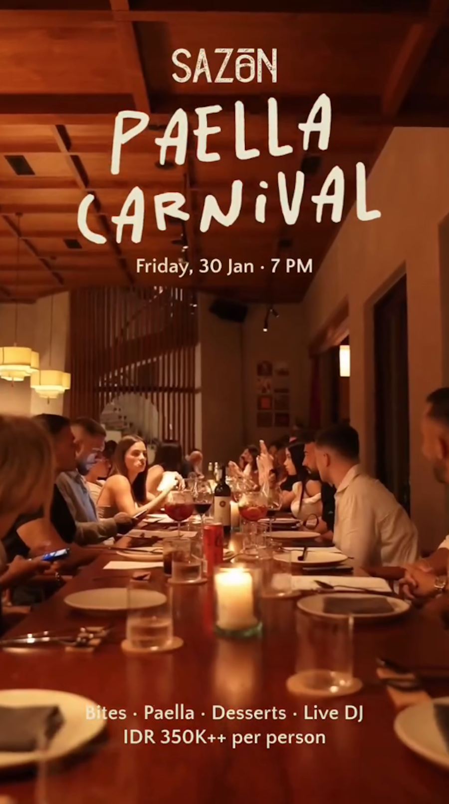 A carnival of flavour, built around one big paella. Start with bites, gather around the pan, end on dessert – all soundtracked by DJ MIIA. Friday, 30 Jan at 7 PM IDR 350K++ per person Big paella. Loud flavours. Good times.