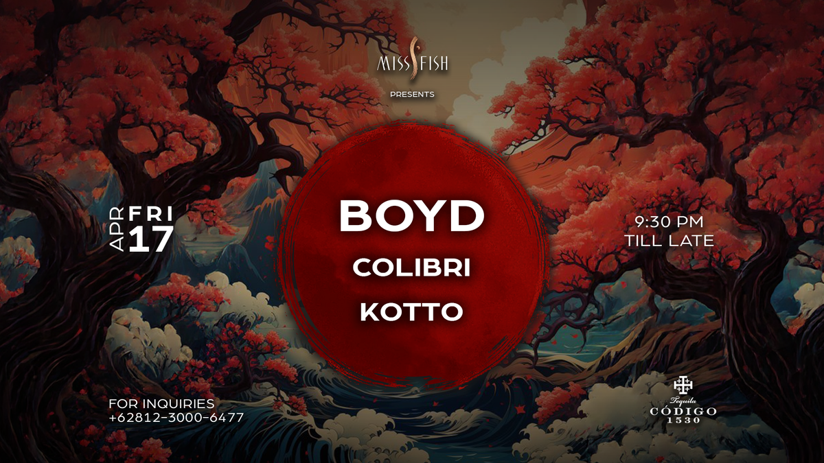 Miss Fish presents featuring Boyd, Colibri, and Kotto for a refined Friday night of immersive grooves and elevated atmosphere from 9:30 PM till late.