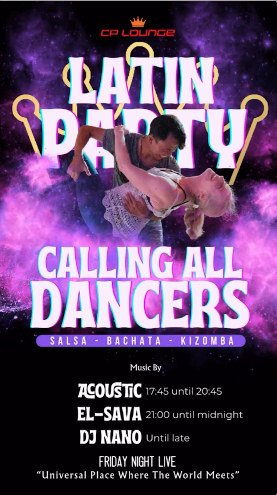 At 9 PM, Latin rhythms fill the room, conversations soften, and the floor slowly comes alive.