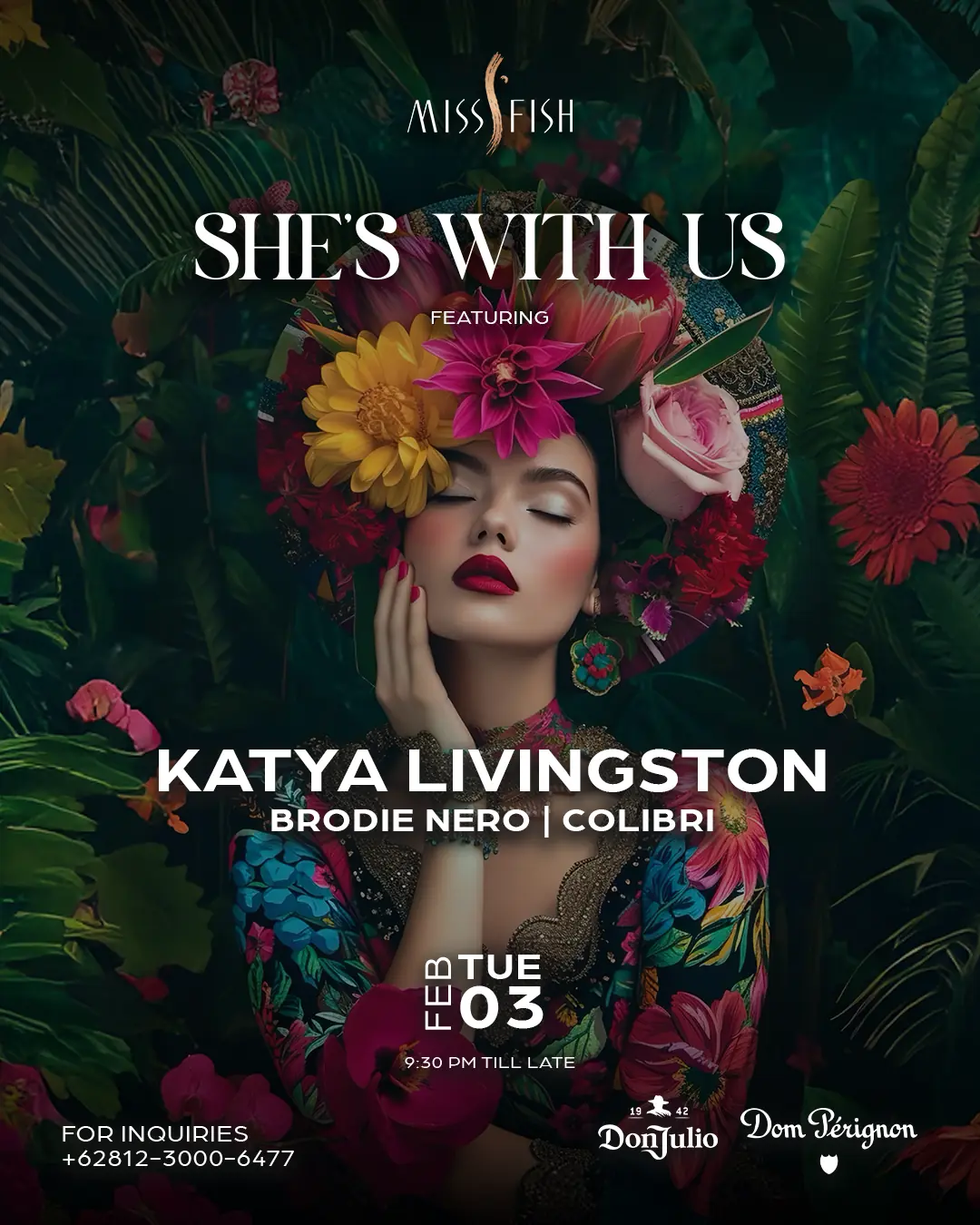 This Tuesday, Sheβs With Us opens into an elegant night driven by deep emotion and refined rhythm, featuring Katya Livingston alongside Brodie Nero and Colibri.
