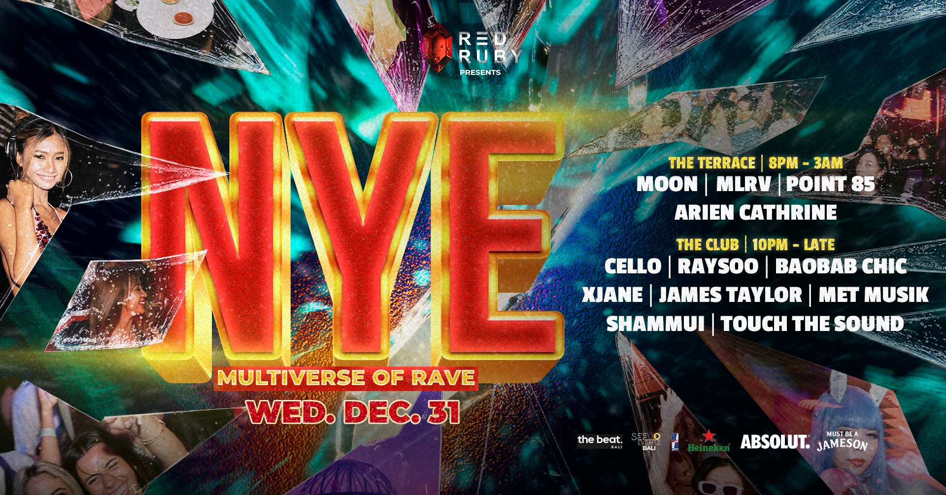 Red Ruby NYE brings you the ๐๐ฎ๐ฅ๐ญ๐ข๐ฏ๐๐ซ๐ฌ๐ ๐จ๐ ๐๐๐ฏ๐ โ Expect a night of a high-voltage journey through heavy beats, immersive lights, and a room that feels like itโs shifting around you.