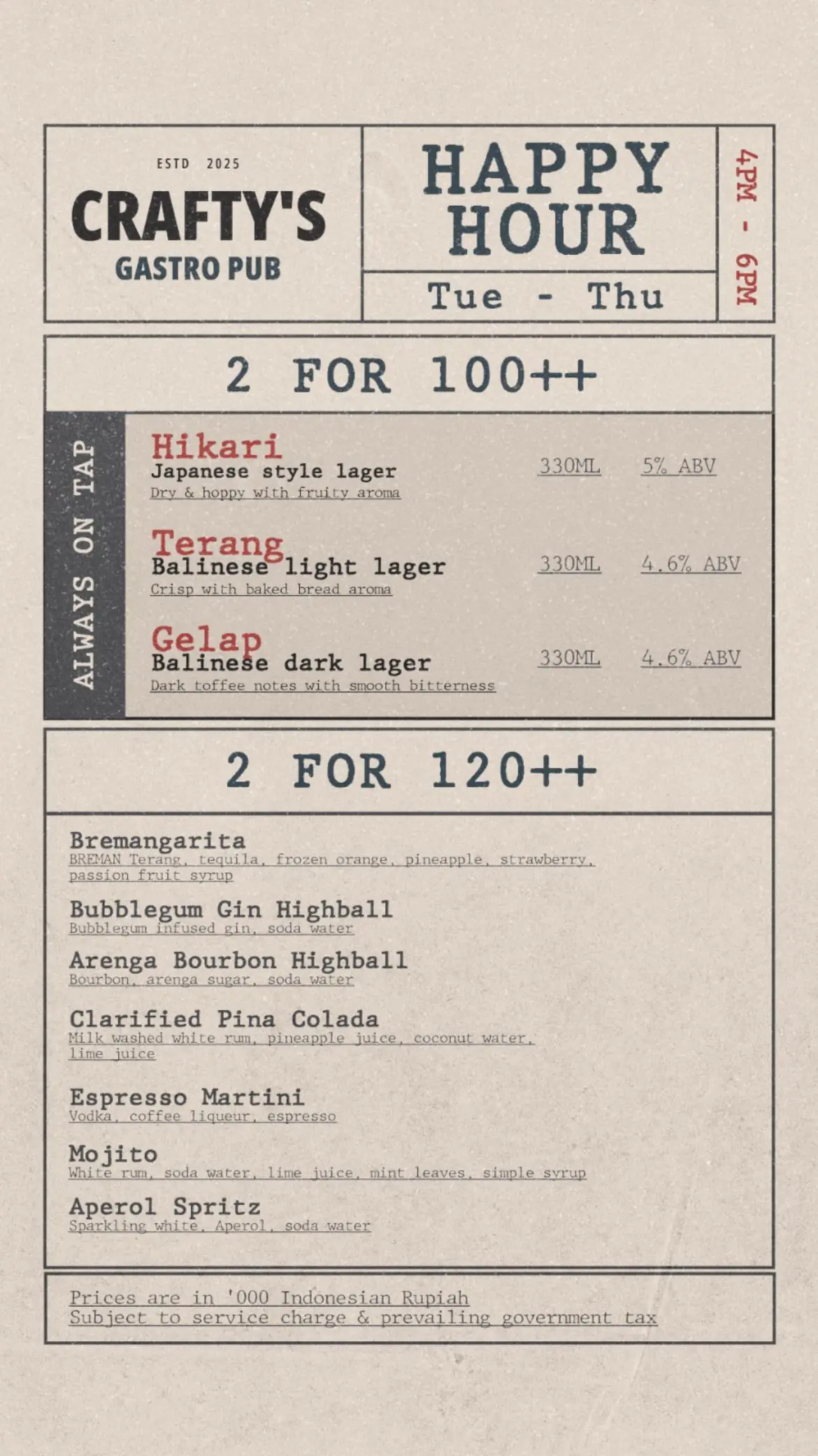 Happy Hour at Crafty's Gastro Pub Tue-Thur 4-6pm