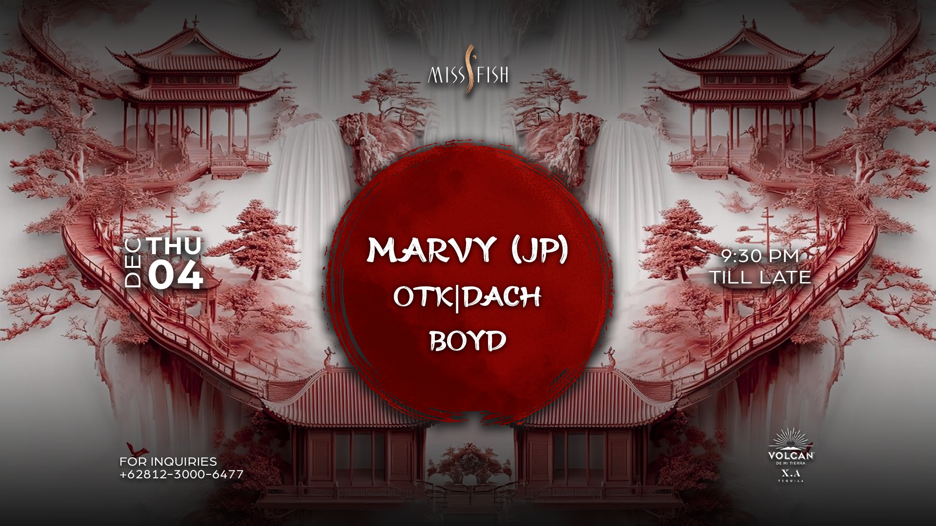 This Thursday, Miss Fish invites you into a night shaped by deep rhythms and refined energy, featuring Marvy (JP) with OTK|DACH and Boyd on deck.